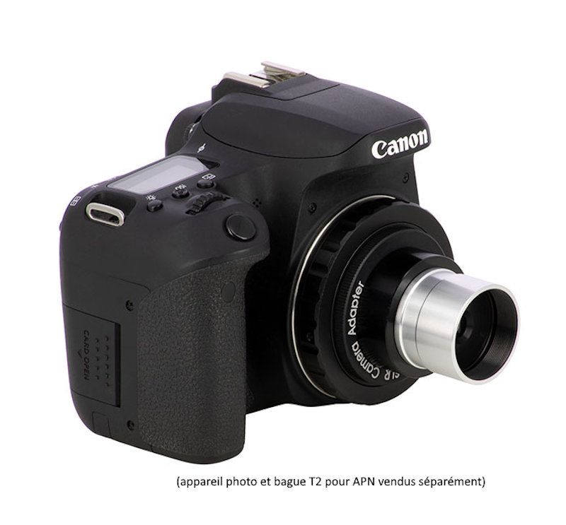 Il est possible de fixer la Nomad 5 sur un appareil photo numérique grâce à un adaptateur T2 court (fourni). Vous devrez toutefois vous procurer, en plus, une bague T2 classique dont la sortie mécanique sera spécifique au type de monture de votre boîter photographique (Nikon F, Canon EF, Canon RF, etc). La bague T2 pour appareil photo n'est pas fournie (voir produits complémentaires) !