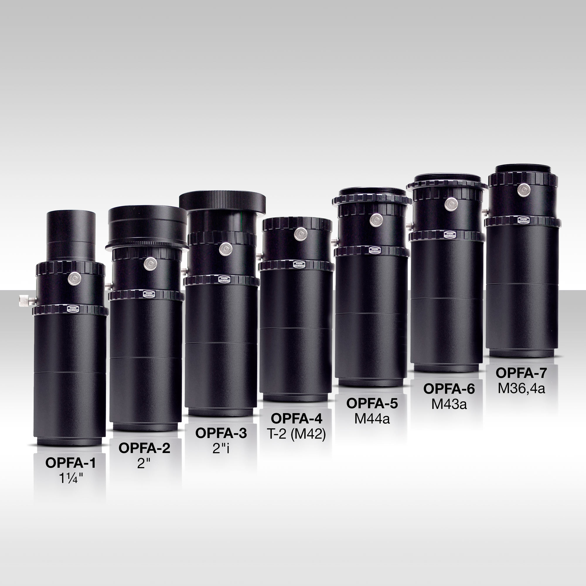 Chaque OPFA est un ensemble complet d'accessoires pour la photographie focale et la projection d'oculaire avec connexion au télescope, dispositif de mise au point coulissant et 2 tubes d'extension T-2 de 40 mm. Un anneau T-2 adapté à votre appareil photo doit être commandé séparément.