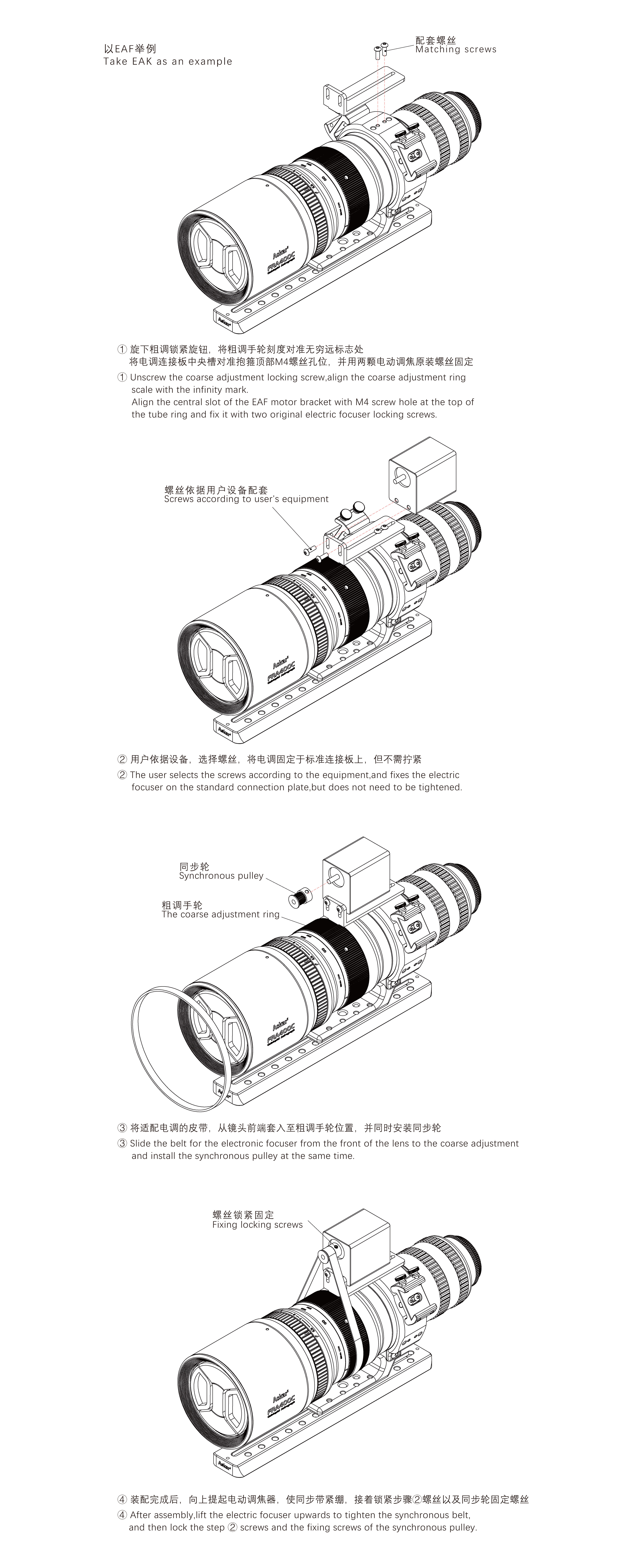 L'installation consistera à fixer le moteur de mise au point avec sa platine d'origine, puis à installer la poulie sur le moteur, puis la courroie entre la mise au point de la FRA400C et la poulie, puis à tendre la courroie en agissant sur la position du moteur. Enfin vous fixerez le moteur en position en vous assurant d'une bonne tension de courroie sans toutefois trop tendre celle-ci.