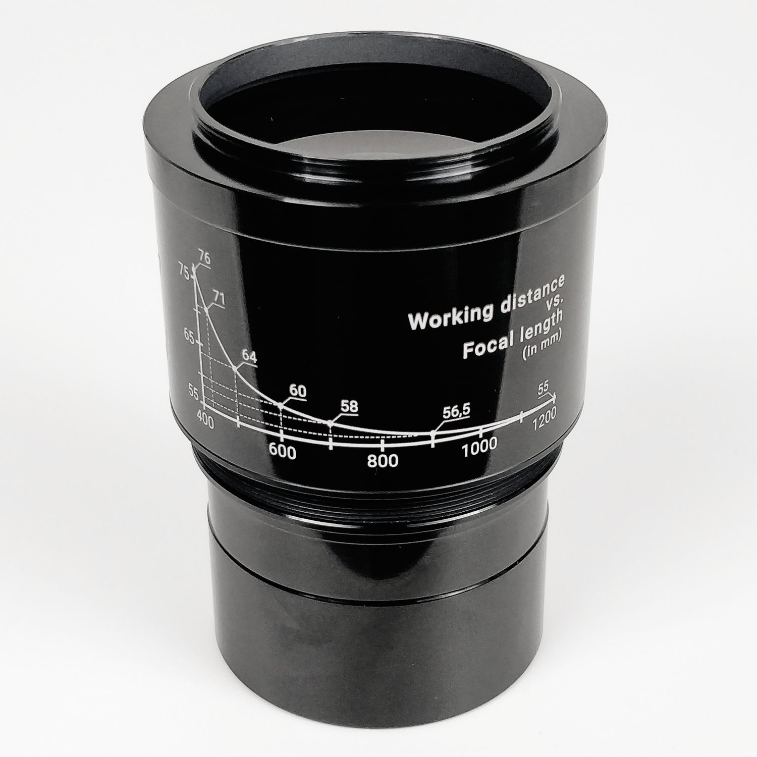- Distance de travail (tirage idéal) entre 55 et 76 mm (et plus), la distance de travail optimale pour différentes focales est représentée sur le corps du correcteur