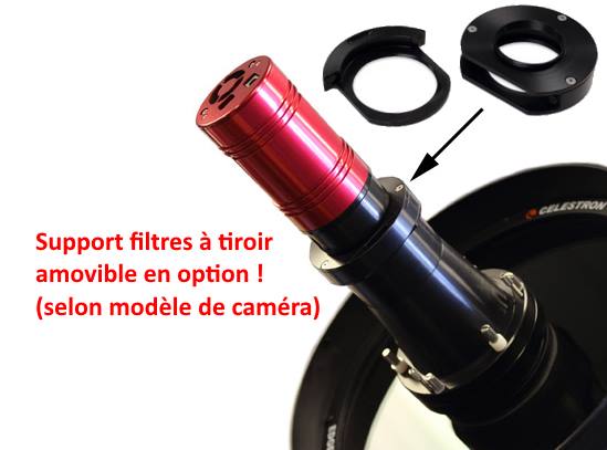 Nous recommandons chaudement de choisir cette option car elle vous permet de placer facilement des filtres entre la caméra et l'Hyperstar. Il s'agit d'un support MFS starizona qui est adapté à l'hyperstar. Il est important de bien choisir cette option car l'adaptateur Hyperstar pour la caméra sera plus court ou plus long selon que vous prendrez le MFS ou pas. Si vous choisissez l'option "avec support filtres à tiroir", un premier tiroir est fourni, avec un filetage M48 standard pour filtres 2" (50,80 mm). Les tiroirs sont disponibles également séparément : Cliquez-ici !