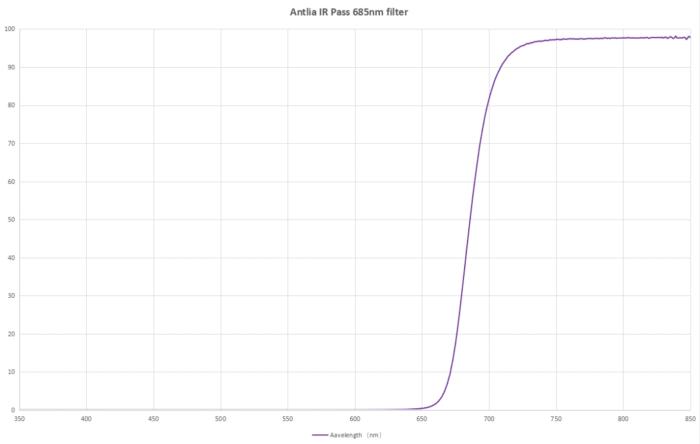 Le filtre Antlia IR Pass 685 nm est un filtre absorbant qui permet aux infrarouges de plus de 685 nm de longueur d'onde à traverser. À ces longueurs d'onde, la sensibilité de l'œil nu est réduite, de sorte qu'il n'est pas adapté aux observations visuelles.