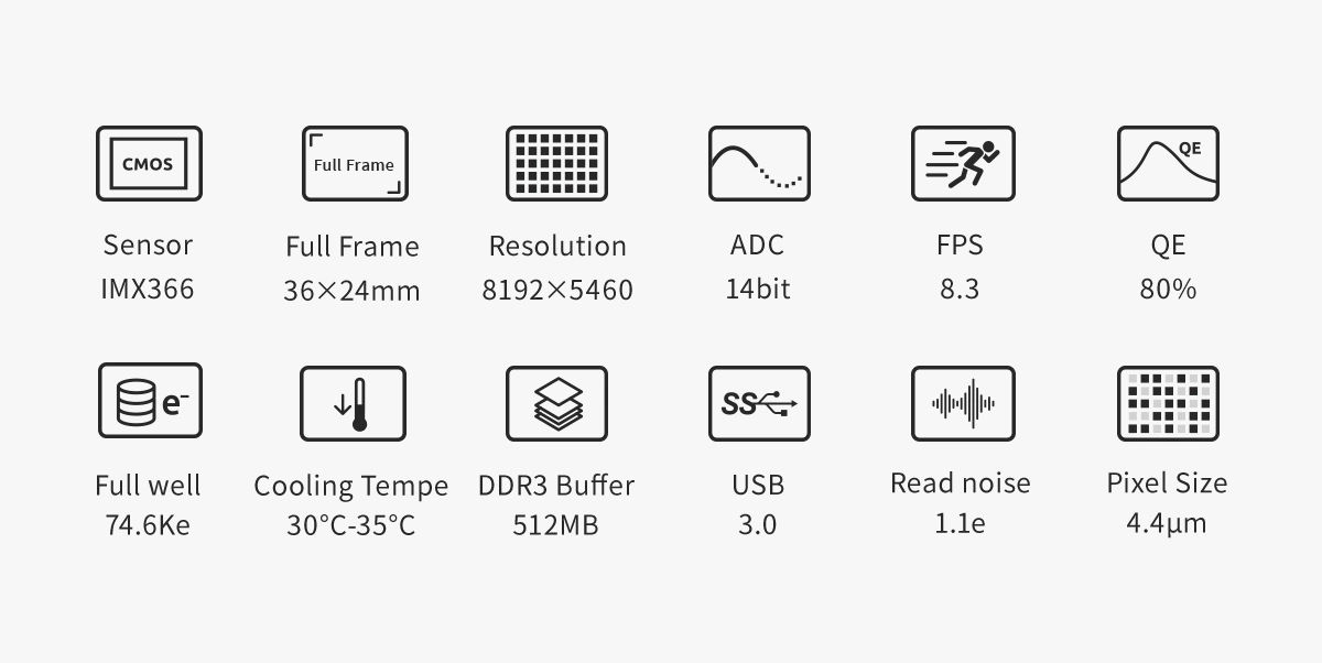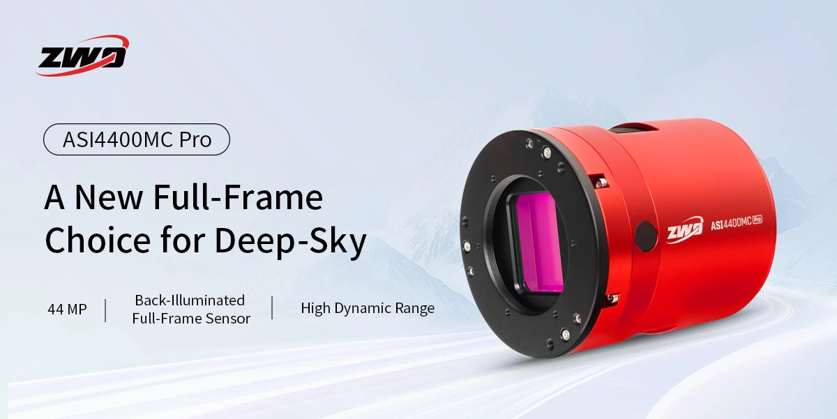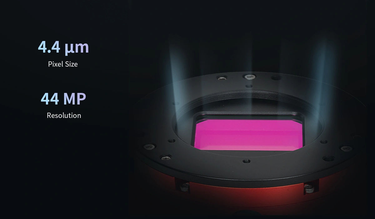 La caméra ASI4400MC Pro utilise un capteur plein format rétroéclairé de 36 × 24 mm (diagonale de 43,3 mm). Avec ses 44 mégapixels et ses pixels de 4,4 μm, elle offre une résolution et une sensibilité à la lumière exceptionnelles. Le format plein format permet de capturer l'intégralité du champ visible par l'optique, sans recadrage ni perte d'image, idéal pour les sujets à grand champ et les objets du ciel profond.