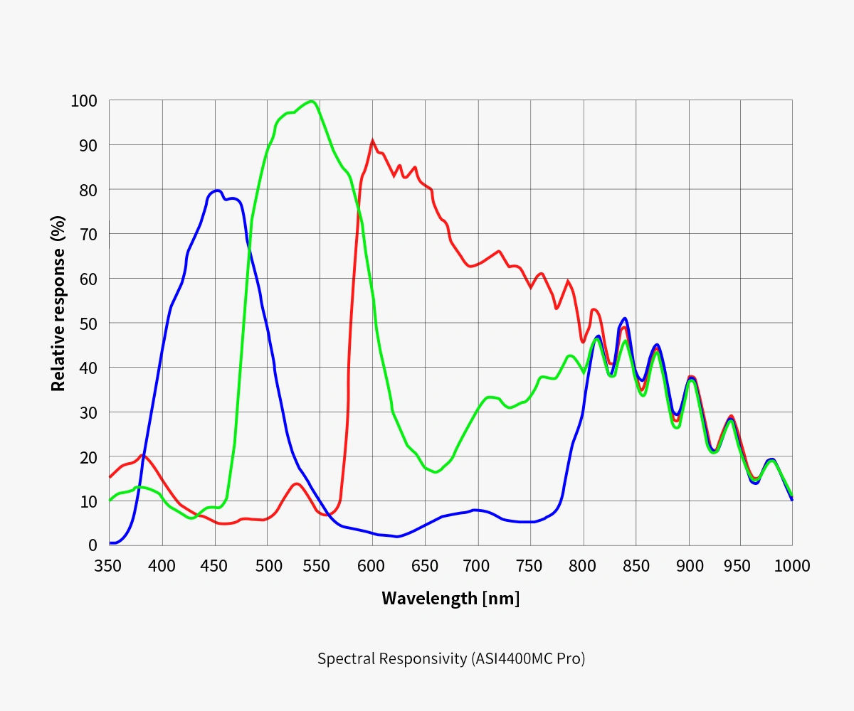La caméra ASI4400MC Pro est équipée d'origine d'un filtre anti-UV et anti-infrarouges placé devant le capteur. Ce filtre bloque les rayonnements ultraviolets et infrarouges indésirables, responsables du flou des étoiles et de la distorsion des couleurs, ne laissant passer que les longueurs d'onde visibles.