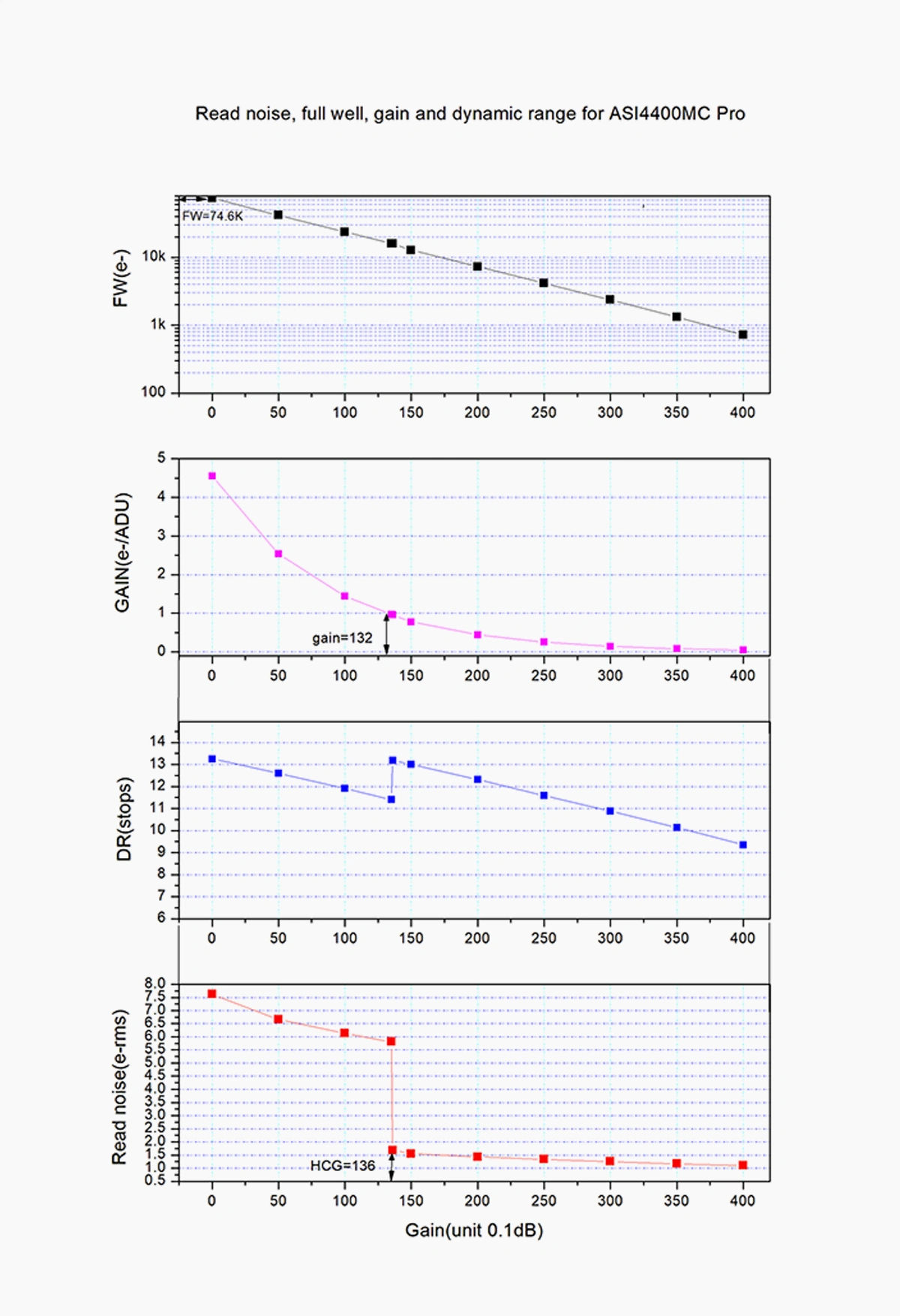 La caméra ASI4400MC Pro offre une plage dynamique allant jusqu'à 13 diaphragmes, permettant de capturer aussi bien les hautes lumières que les détails les plus subtils dans les ombres en une seule exposition. Cette large plage est essentielle pour obtenir des performances HDR (High Dynamic Range), préservant ainsi les transitions tonales fines et les nuances de couleurs délicates des images du ciel profond. Lorsque le gain atteint 136, la caméra active automatiquement le mode HCG (High Conversion Gain), qui réduit considérablement le bruit de lecture tout en conservant la plage dynamique complète. Vous pouvez ainsi augmenter la sensibilité pour les objets peu lumineux sans ajouter de bruit de gain indésirable, ce qui facilite la capture d'images nettes et détaillées dans diverses conditions.