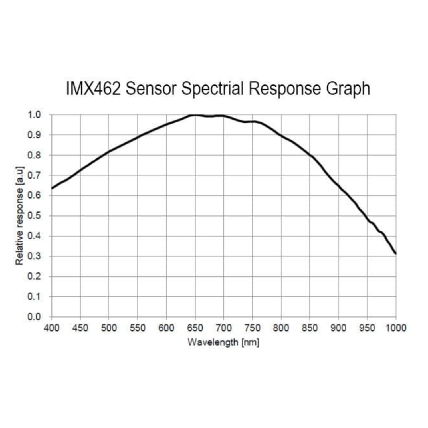Le format du capteur IMX462 est de 1/2,8”. La longueur et la largeur du capteur sont respectivement de 5,57 mm x 3,13 mm, pour une diagonale de 6,39 mm. Avec une résolution de 1920 x 1080 et des pixels de 2,9 µm x 2,9 µm, ce capteur rétroéclairé (BSI) offre une excellente sensibilité dans la partie rouge et infrarouge du spectre, idéale pour les applications astronomiques.