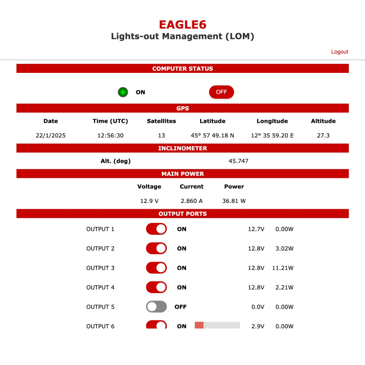 La fonctionnalité Lights-Out Management (LOM) du nouvel EAGLE6 pousse le contrôle et la surveillance à distance à un niveau supérieur, garantissant que tout est prêt pour l’observation, même avant l’allumage du EAGLE6. Grâce à un port Ethernet dédié, le LOM permet de surveiller l’état opérationnel de l’ordinateur, de l’allumer à distance, de contrôler les capteurs et de gérer les ports USB et d’alimentation indépendamment du système d’exploitation. Cela en fait un outil idéal pour les télescopes contrôlés à distance, où l’accès physique à l’équipement est limité ou peu pratique. Vous pouvez accéder au LOM en connectant un câble Ethernet au port LOM du EAGLE depuis un ordinateur sur le même réseau.