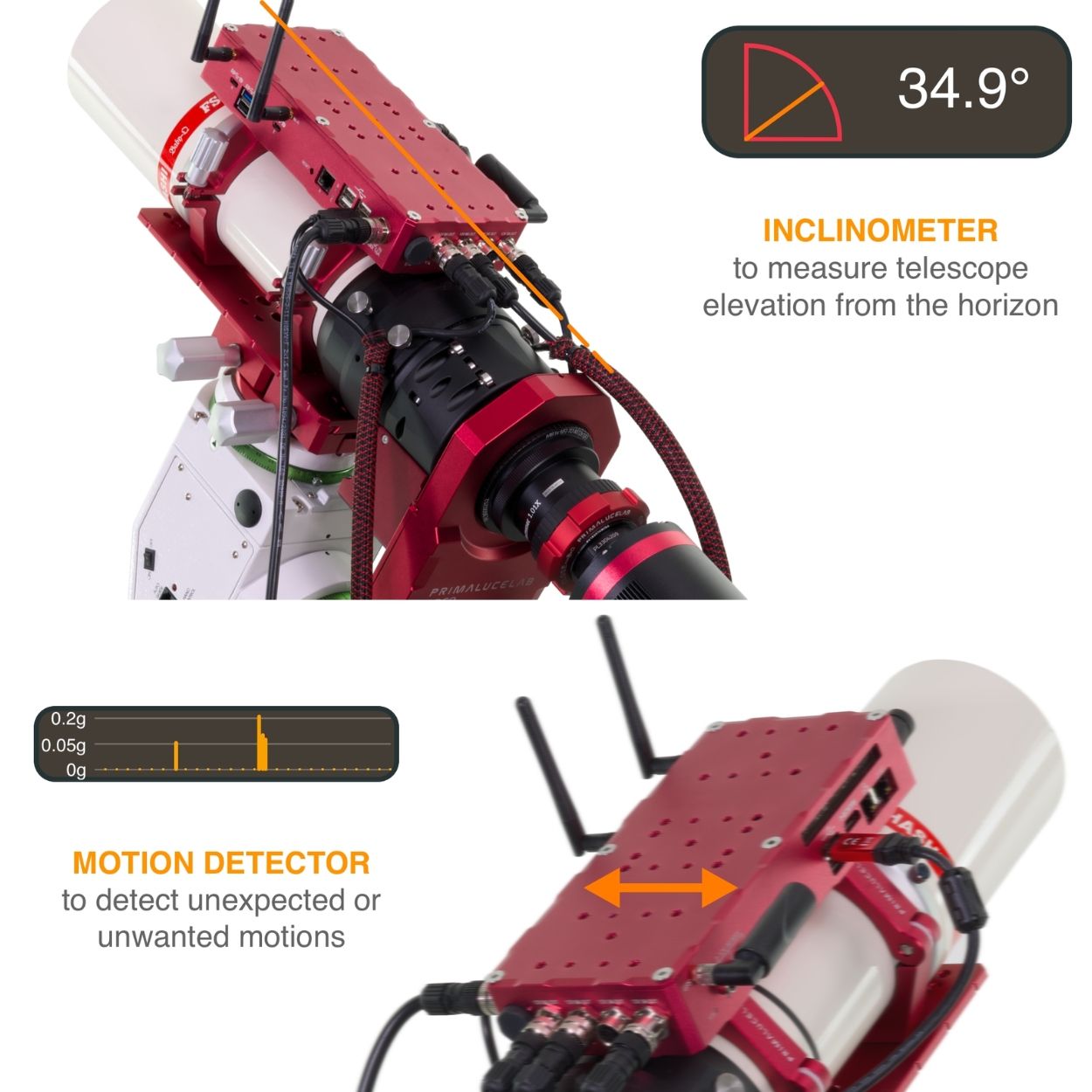 Le capteur d’inclinaison intégré au EAGLE mesure l’élévation de votre télescope par rapport au niveau de l’horizon avec une résolution de 0,1° et une marge d’erreur moyenne inférieure à 1°. Les données d’inclinaison sont affichées en temps réel dans EAGLE Manager X. Le capteur fonctionne même si le EAGLE est installé à l’envers, ce qui vous permet de vérifier à distance si votre télescope est correctement aligné sur l’élévation souhaitée.