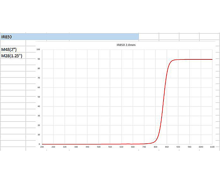 - Bande passante à partir de 720 nm ou 850 nm (au choix) : la lumière visible est bloquée