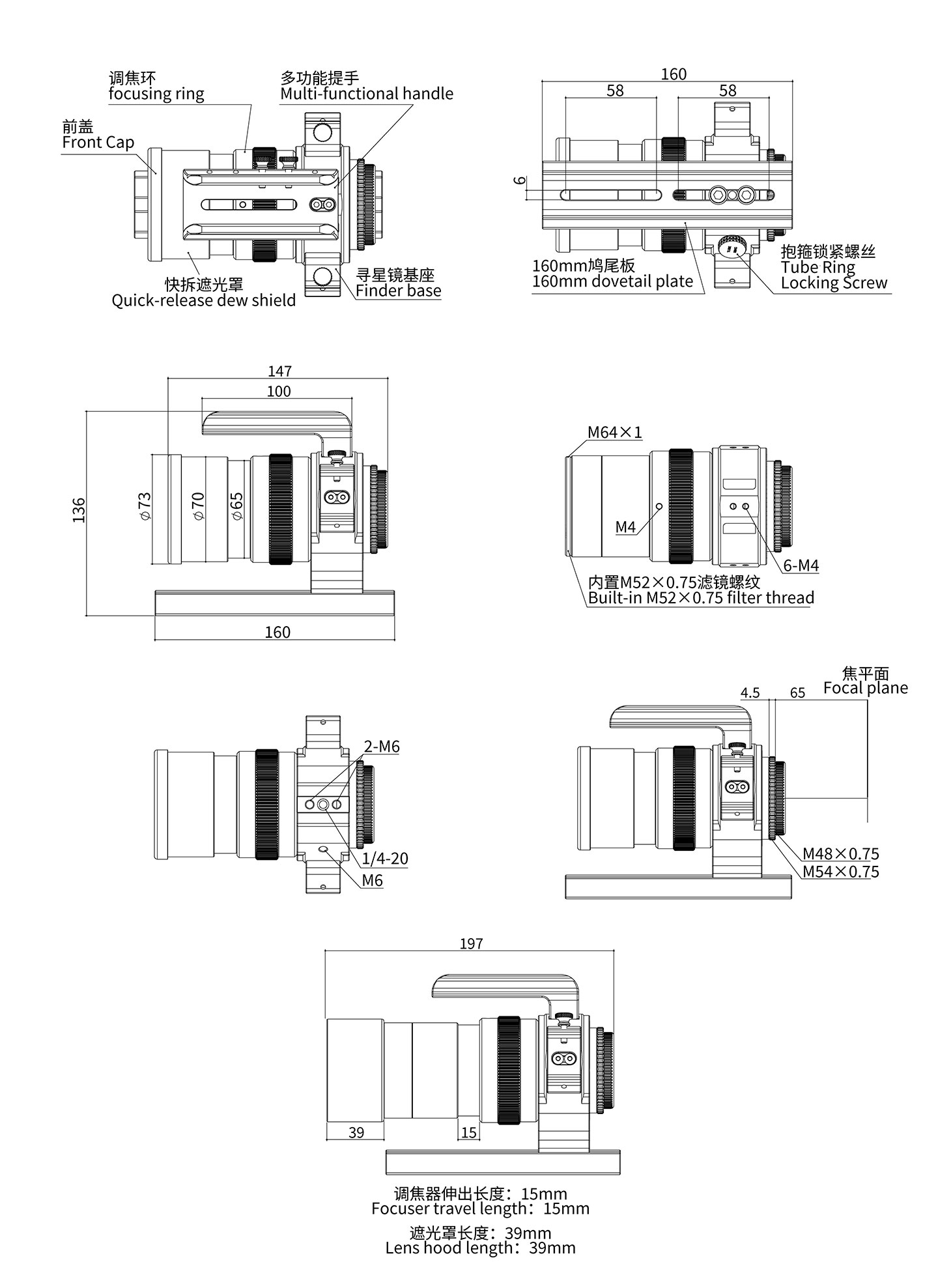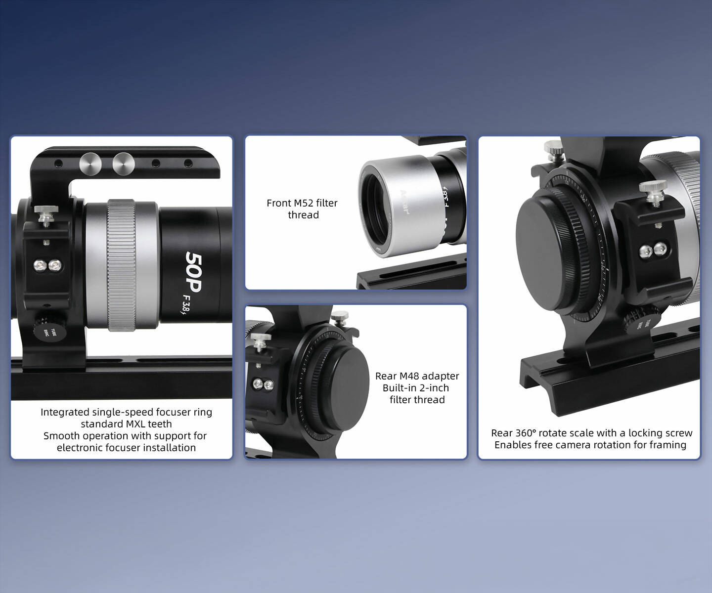 - Filetage arrière : Adaptateur M54x0,75, M48x0,75 (avec filetage femelle pour filtre M48x0,75)