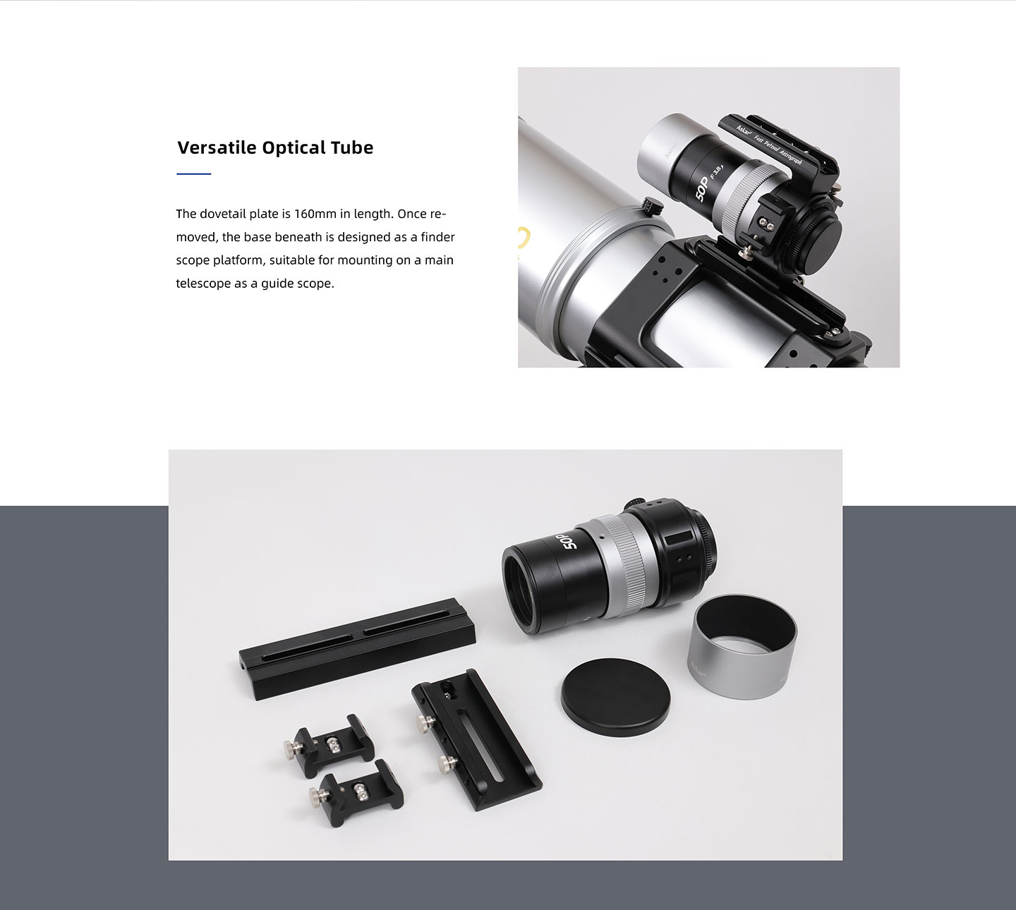 - Embases pour chercheur : 2 embases standard mini-Vixen standard, 1 fixation Arca-Swiss standard dans la poignée