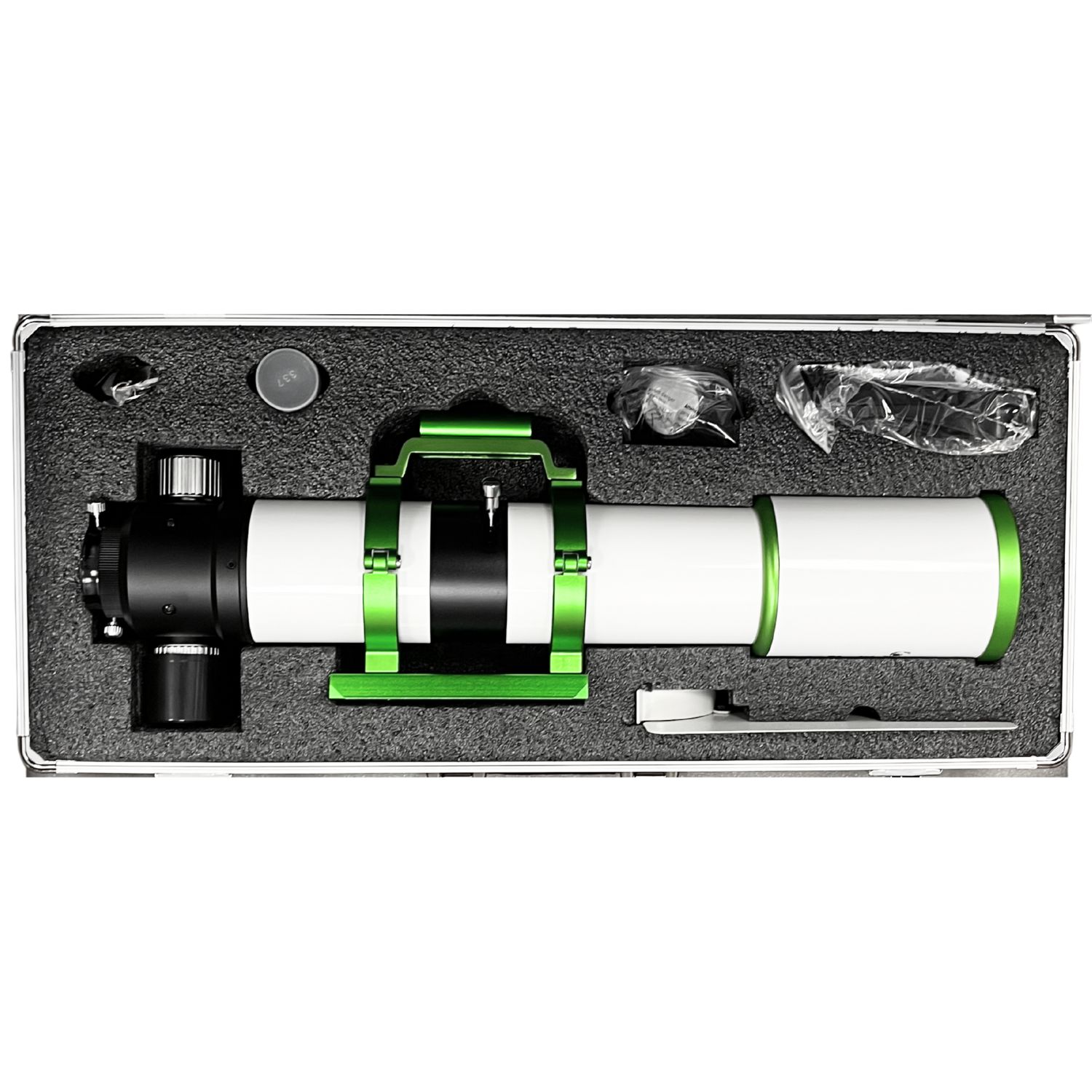 Sky-Watcher fournit plusieurs accessoires pour améliorer l’expérience d’observation. La lunette est livrée dans une valise rigide pour faciliter son transport. Un chercheur solaire pour aligner rapidement l’instrument, ainsi qu’un oculaire de 20 mm avec 70° de champ apparent pour observer le disque solaire dans son intégralité. Le porte-oculaire Crayford au coulant 50,80 mm, avec démultiplication 10:1, offre une mise au point précise, indispensable pour les observations à fort grossissement et les séances d’imagerie. Un adaptateur pour smartphone permet de capturer facilement vos premières images du Soleil.