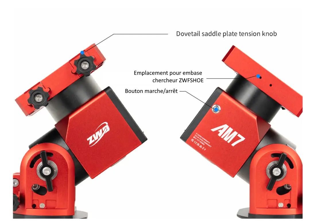 La monture AM7 prend en charge deux modes, vous permettant d'utiliser la même monture pour les observations occasionnelles et l'astrophotographie professionnelle. Le passage d'un mode à l'autre s'effectue en modifiant rapidement la position de la monture à l'aide des vis de réglage. Vous sélectionnez ensuite le mode sur la raquette de commande.
