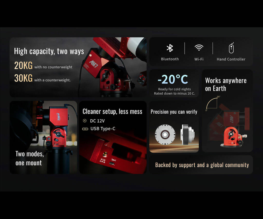 Suivi et GoTo : L’objectif est simple. Un suivi précis et un GoTo fiable sous des charges utiles réelles, pour que vous passiez moins de temps à gérer les limitations et plus de temps à l’astrophotographie et à l’exploration du ciel nocturne.