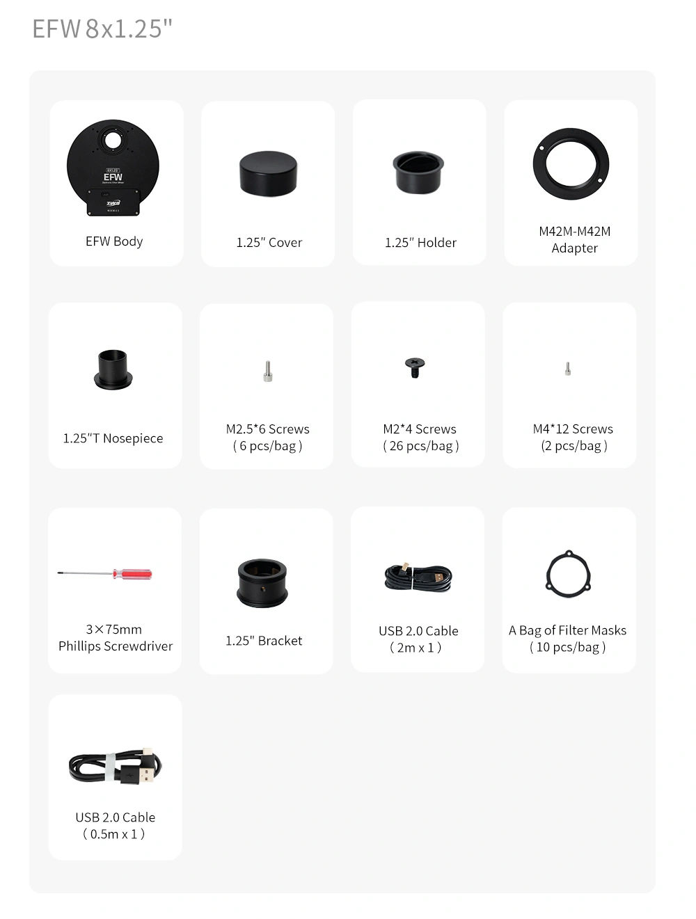 - 1x Roue à filtres ZWO EFW-25 8x31.75 ou 8x31mm non montés.