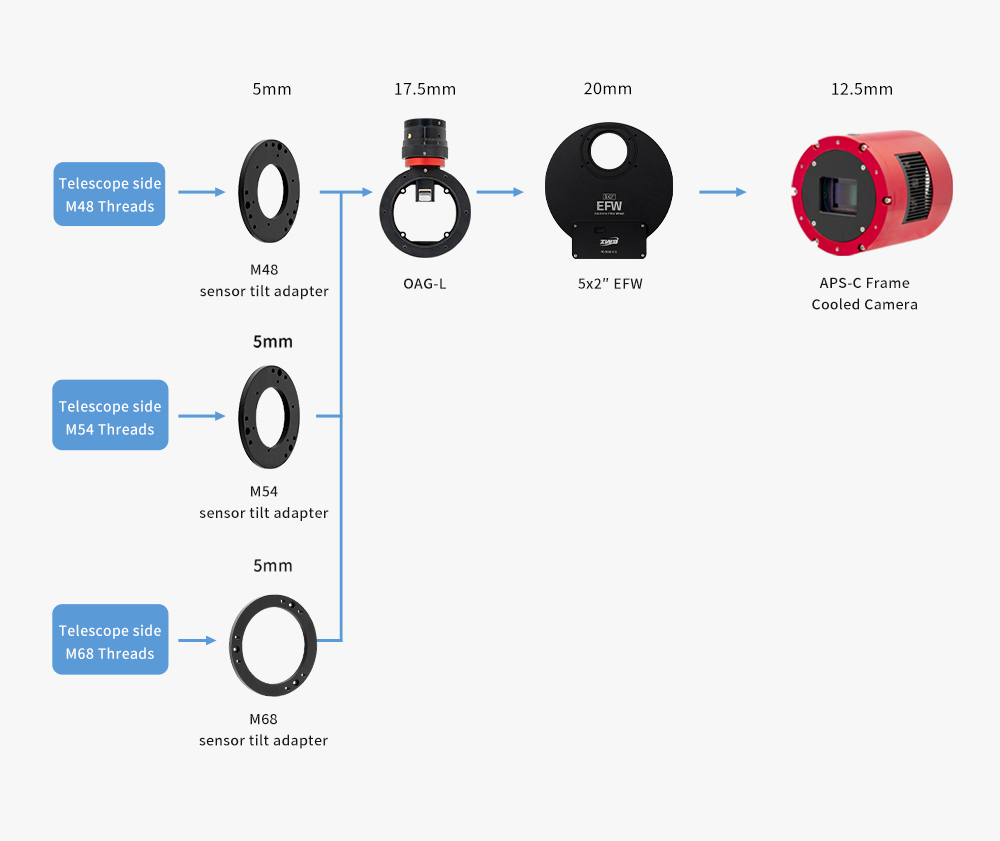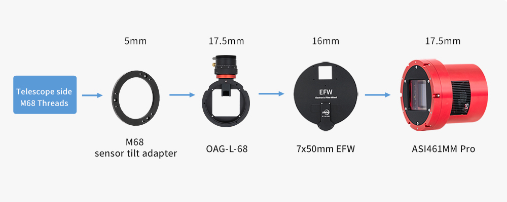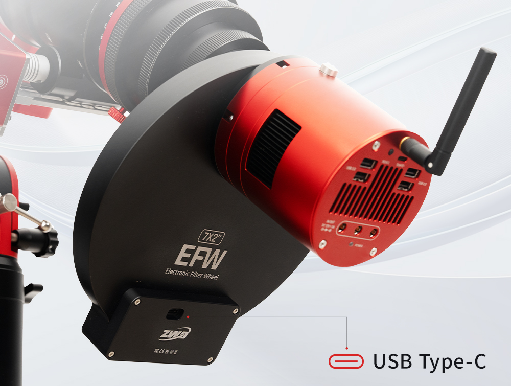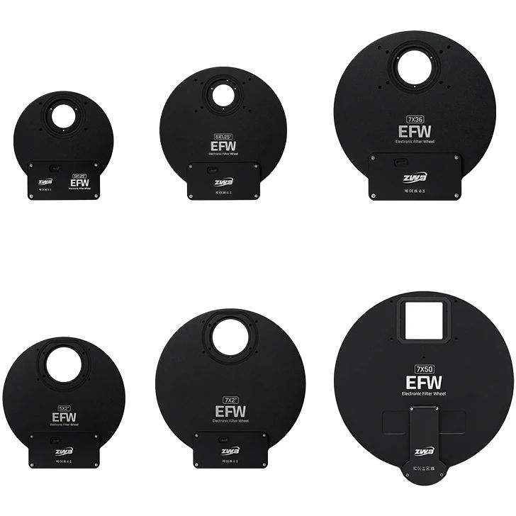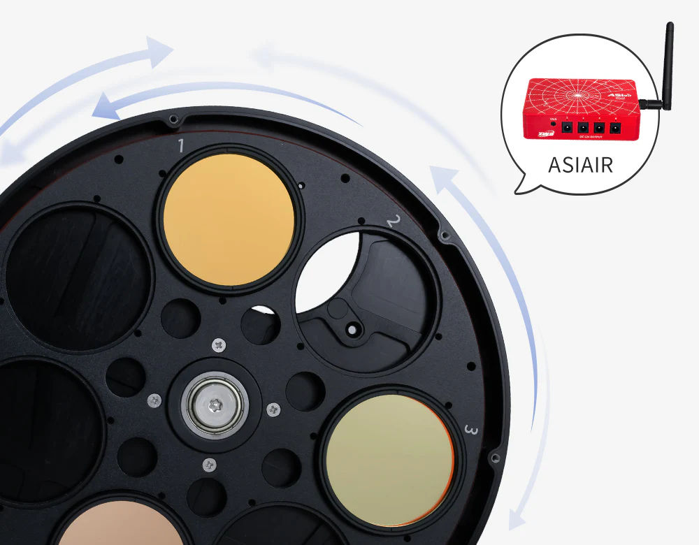 - Changement de filtre automatisé : Entraînement motorisé bi-directionnel chaque roue à filtres avec indexation précise de la position. Associé à un logiciel de contrôle tel que celui de l'ASIAIR (vendu séparément), chaque EFW permet des changements de filtres automatiques pendant une session d'imagerie programmée, permettant ainsi une séance d'imagerie entièrement autonome et mains libres.