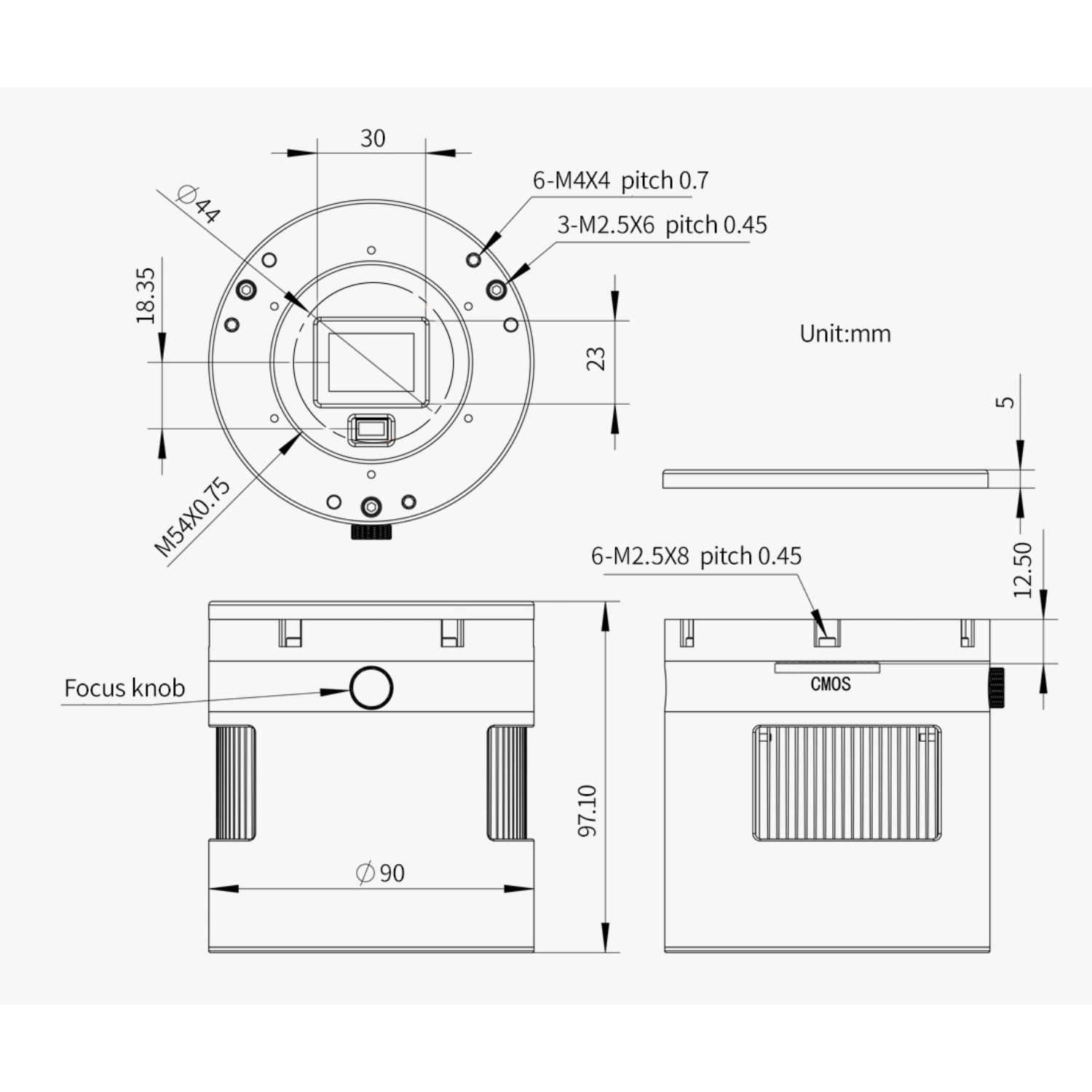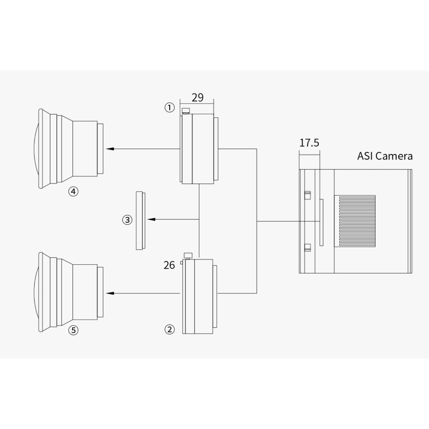 - Tirage interne (distance entre le filetage M54x0,75 mm femelle et le capteur de la caméra) : 17,5 mm