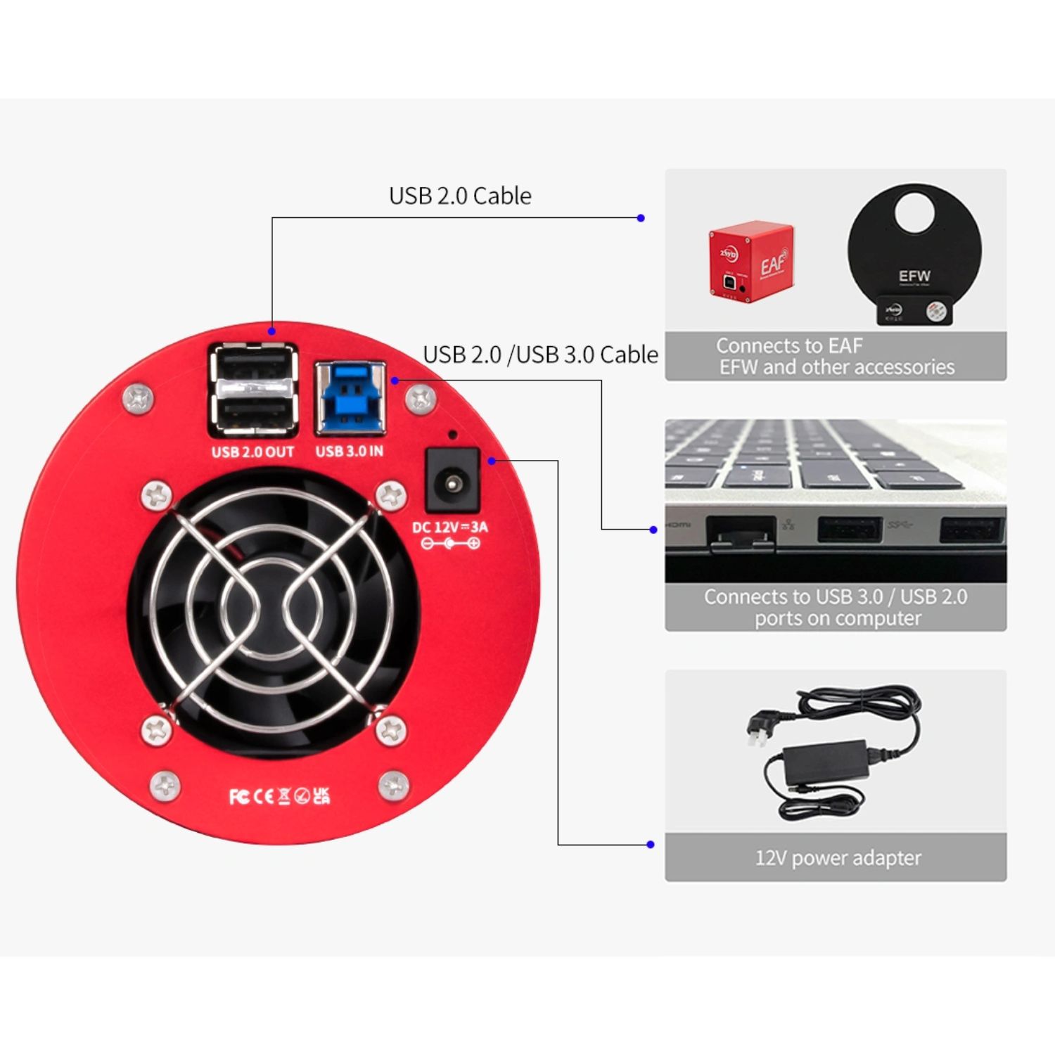 Grâce à sa conception compacte, l'ASI2600 Duo ne nécessite qu'un seul câble USB pour fonctionner. Cela réduit les problèmes de câblage potentiels et améliore la vitesse de configuration. Vous n'avez pas besoin d'un OAG et d'une caméra guide séparés ou d'une lunette guide !