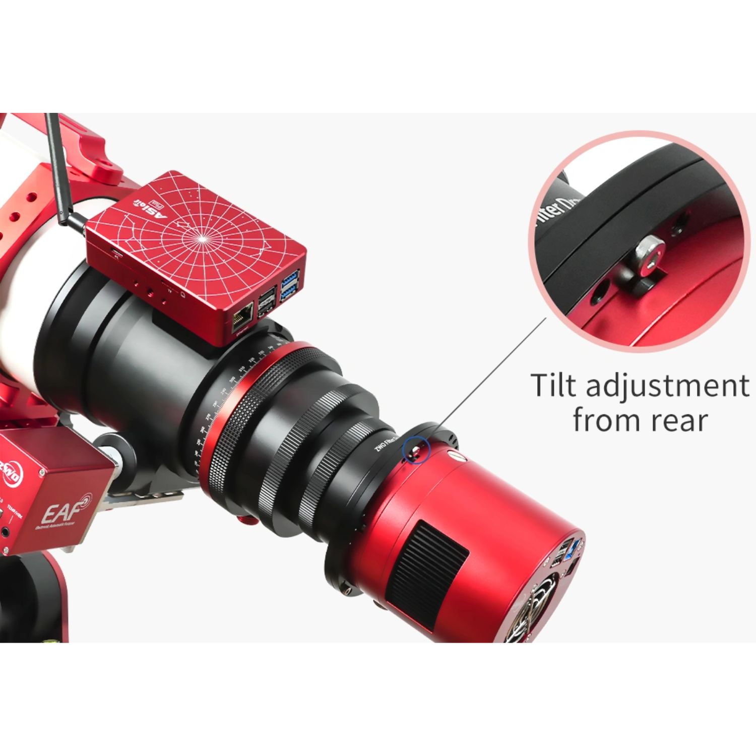 - Le capteur de guidage est un SC2210 de type 1/1,8 avec une excellente sensibilité au proche infrarouge. (identique à celui de la ASI220 Mini)
