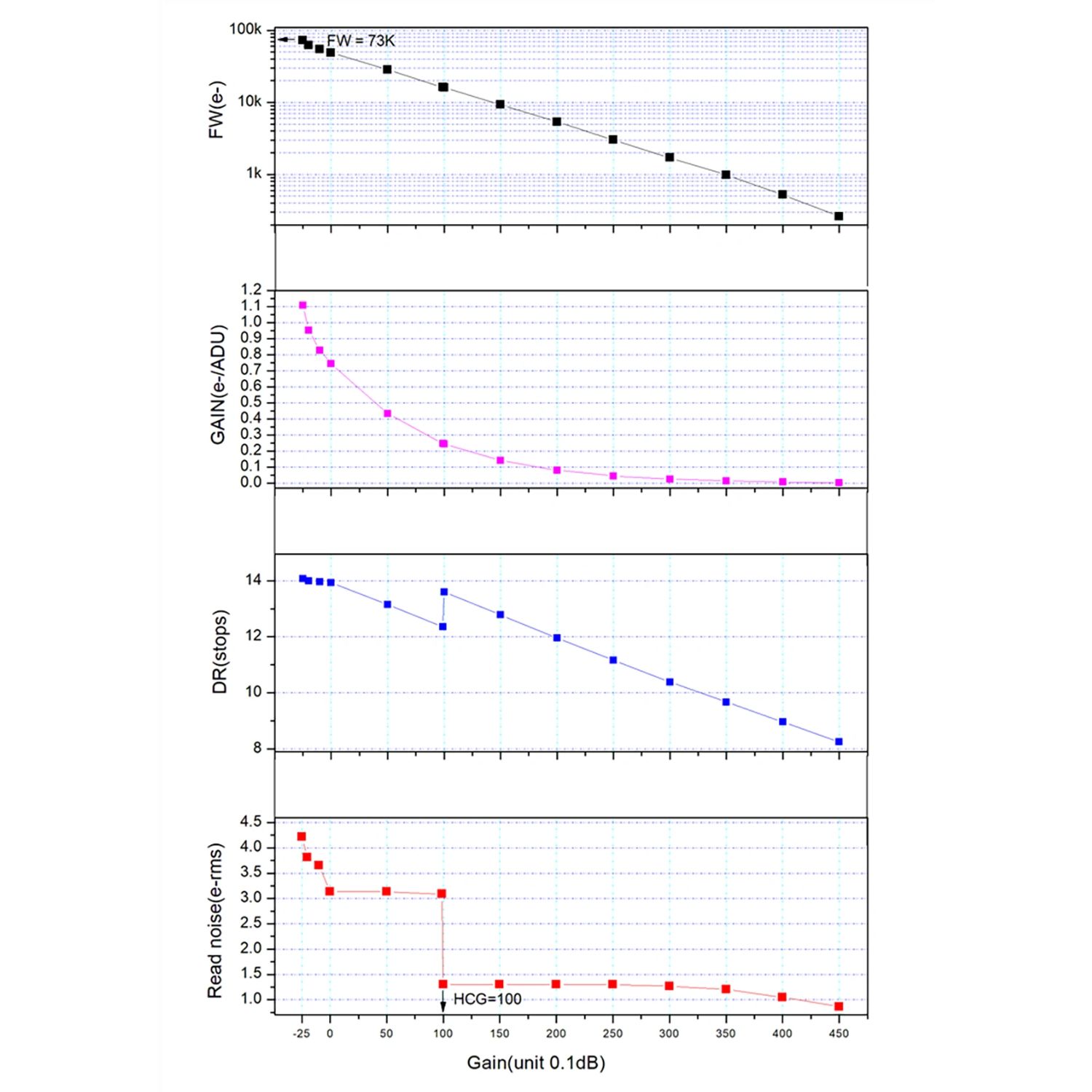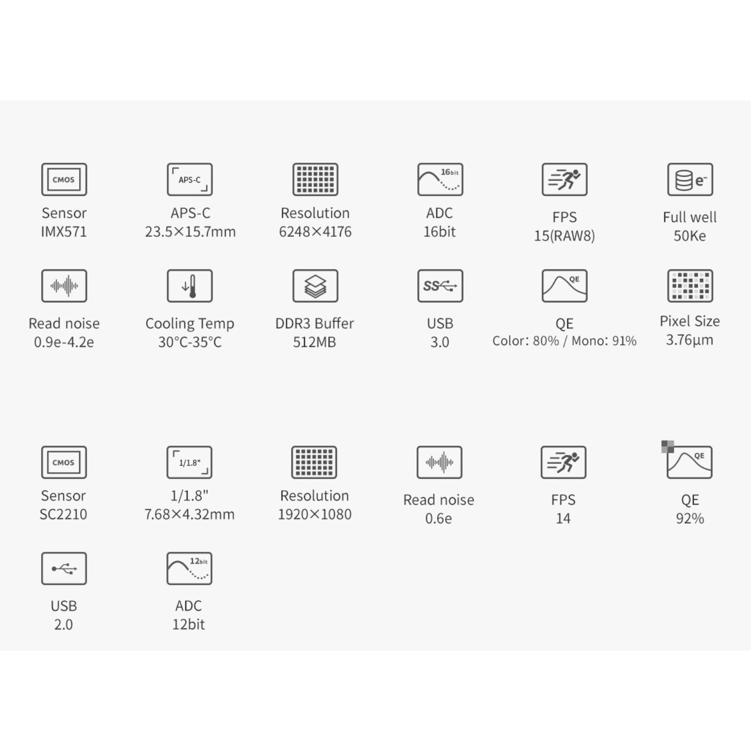 - Le bruit de lecture est aussi bas que 1,0e, et la capacité électronique de chaque pixel atteint un niveau incroyable de 80 ke-.