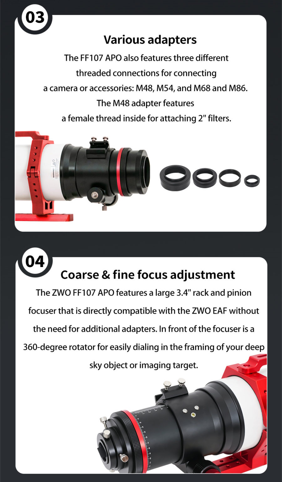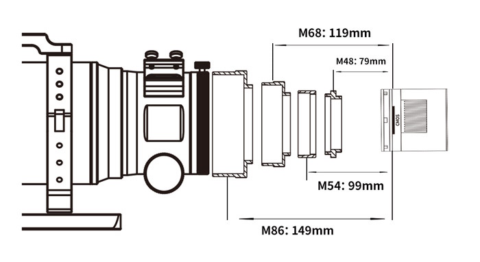 Au lieu d'acheter des correcteurs de champ supplémentaires, de calculer le tirage arrière du correcteur ou d'établir un assemblage complexe et fastidieux pour régler la bonne distance, les astrophotographes pouront simplement visser leurs accessoires photo et caméra derrières les bagues fournies et commencer à faire leur photographies. Il n'y a qu'à faire la mise au point à l'aide du porte-oculaires très qualitatif et lancer les poses photo !