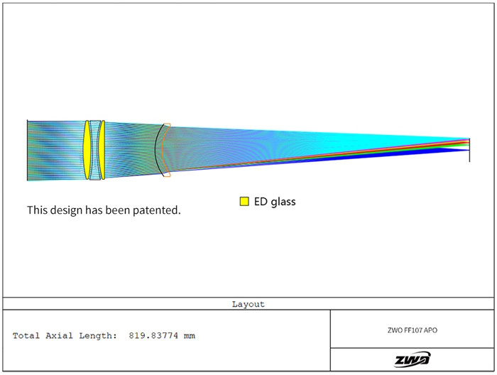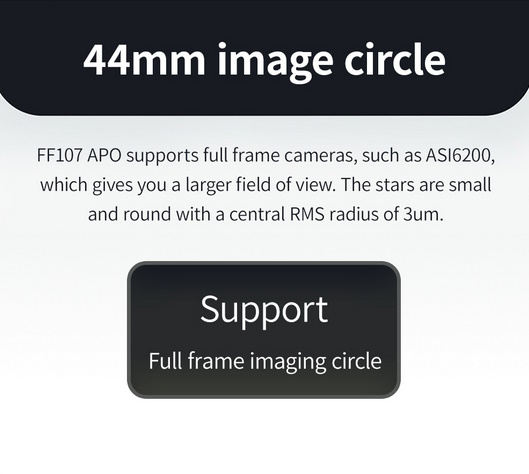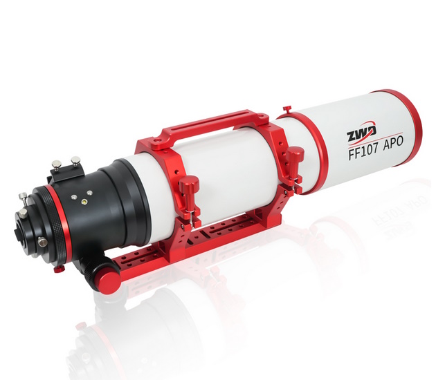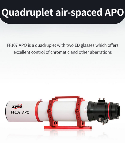 La lunette ZWO FF107 est un astrographe destiné à l'imagerie astronomique du ciel profond à grand champ. Elle fait partie de la nouvelle série de lunettes ZWO FF65, FF80, FF107 et FF130 et possède une ouverture optique utile de 107 mm, une focale de 749 mm et un rapport d'ouverture F/7. Son système optique est constitué d'un quadruplet (4 lentilles) dont un correcteur de champ offrant un cercle image corrigé de 44 mm de diamètre couvrant les capteurs plein-format.