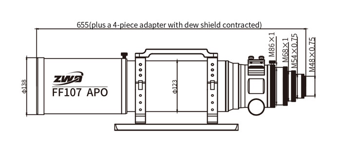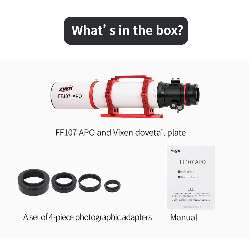 La FF107 est livrée avec un bouchon d'objectif et un pare-buée rétractable, un tube optique de haute qualité usiné et peint par CNC et des pièces décoratives toujours agréables !