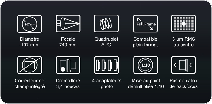 - Ouverture optique utile de 107 mm / Focale 740 mm / Rapport d’ouverture F/7
